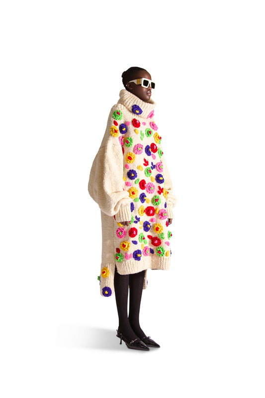 Hand Knit Wool Flower Turtle Neck Dress