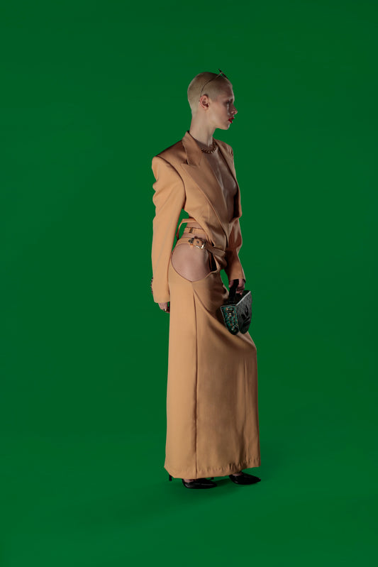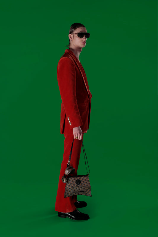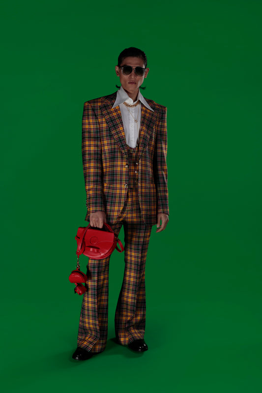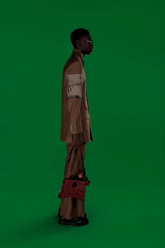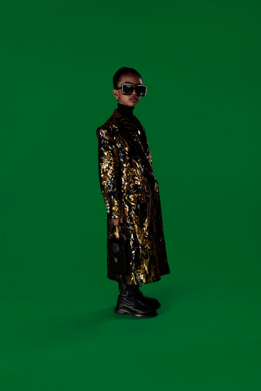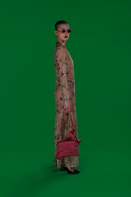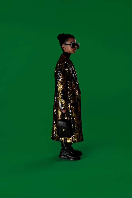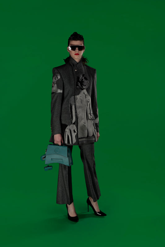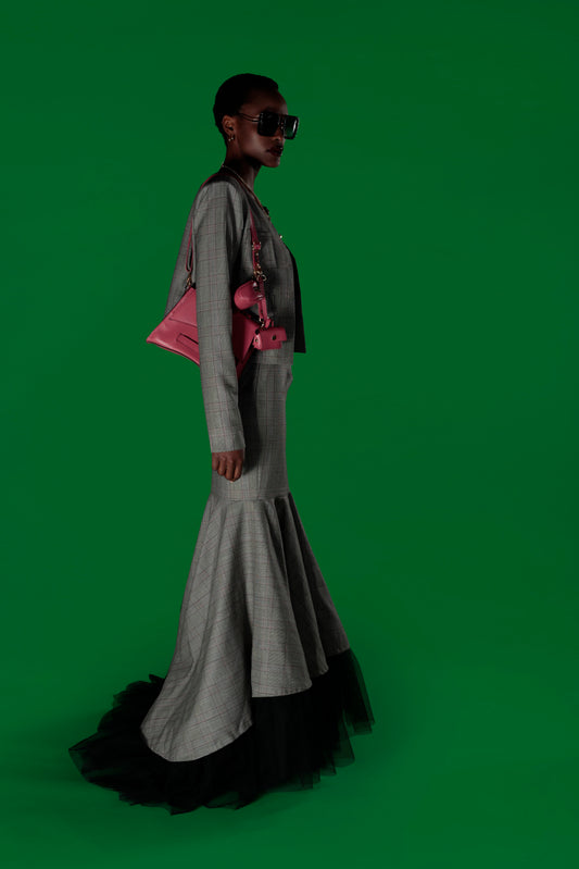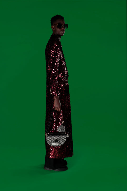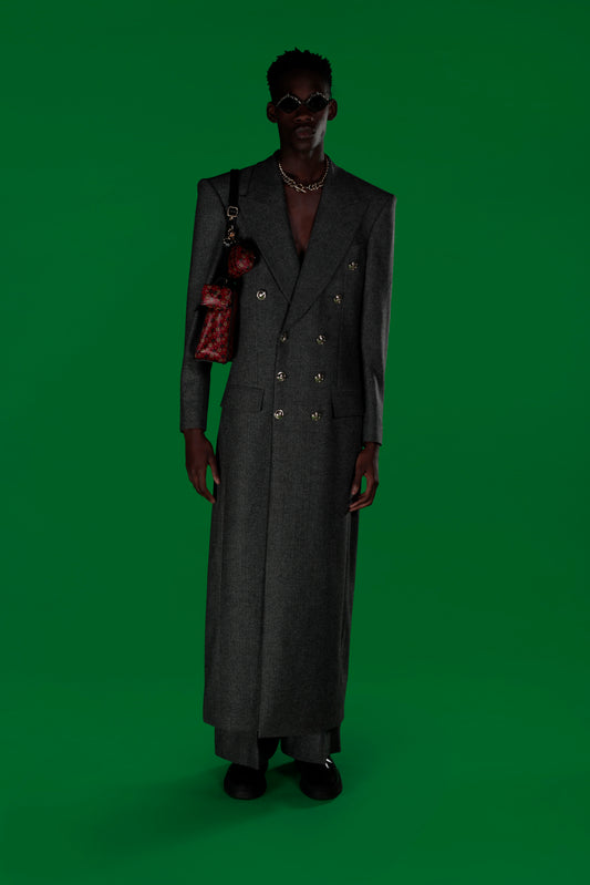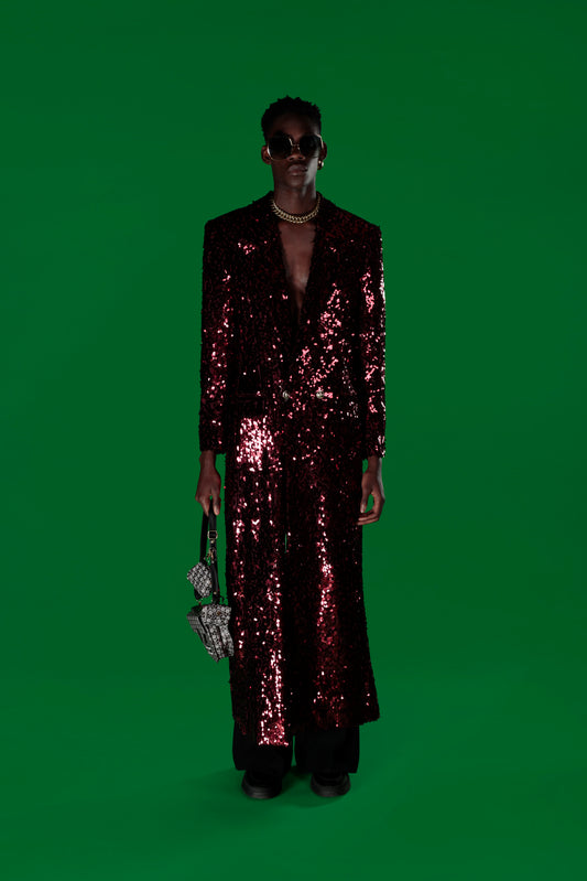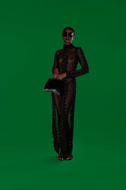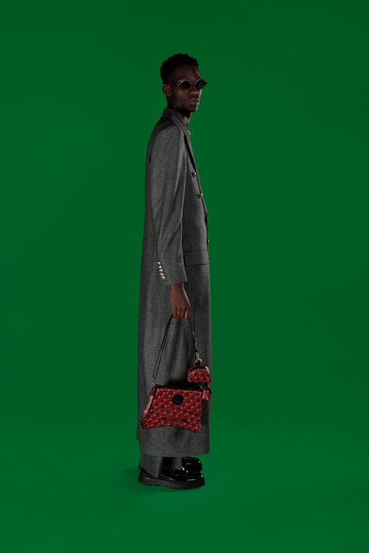 Each piece is created using a variety of fabrics from cashmere wool and tartan to velvet and sustainable vegan leather. Some pieces are created out of a mesh that is embellished with either pearls or sequins that have been hand-embroidered using meticulous skill. The Helen Anthony exclusive print fabric is used to create flowing gowns, three-piece suits and scarves, leather and monogram print unisex bags and accessories. With an abundance of sheer fabrics that bare all to latex three-piece suits that characterise the body’s contours. The uncompromising gold accents of smooth metal hardware embellish the collection with a robust yet unsettling glare of intent.