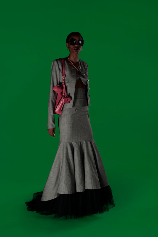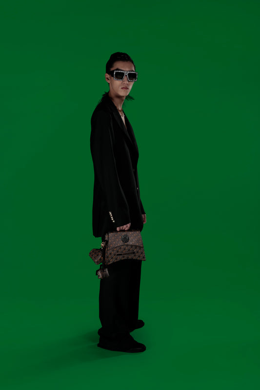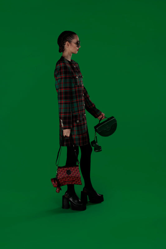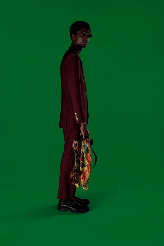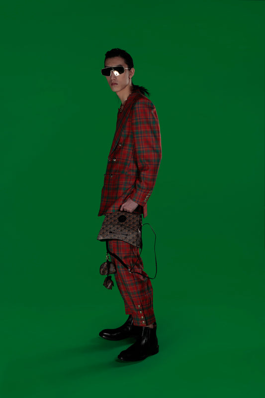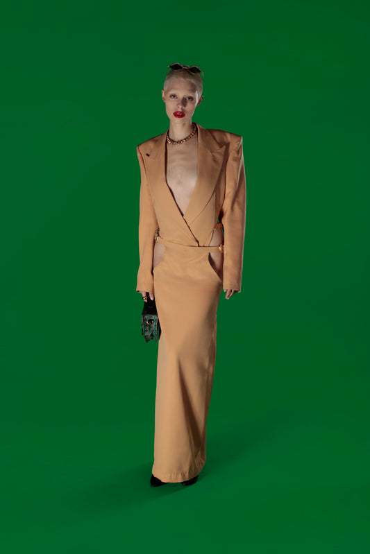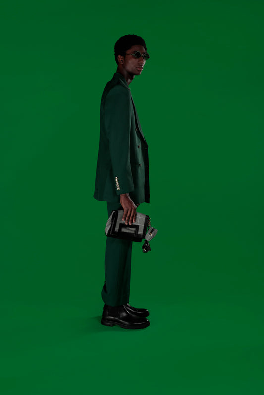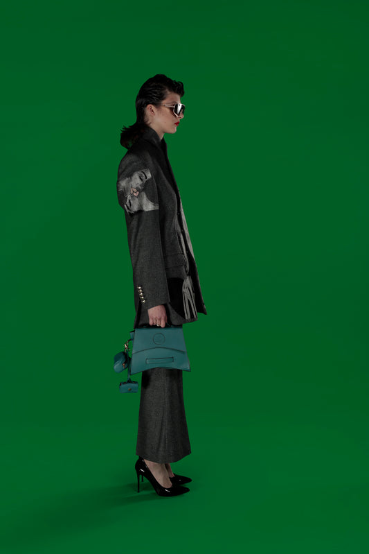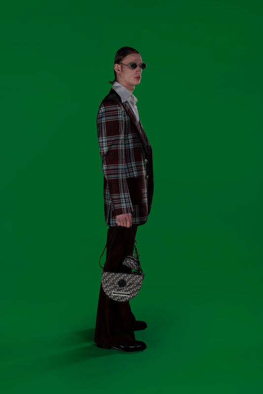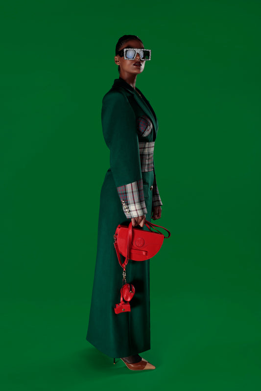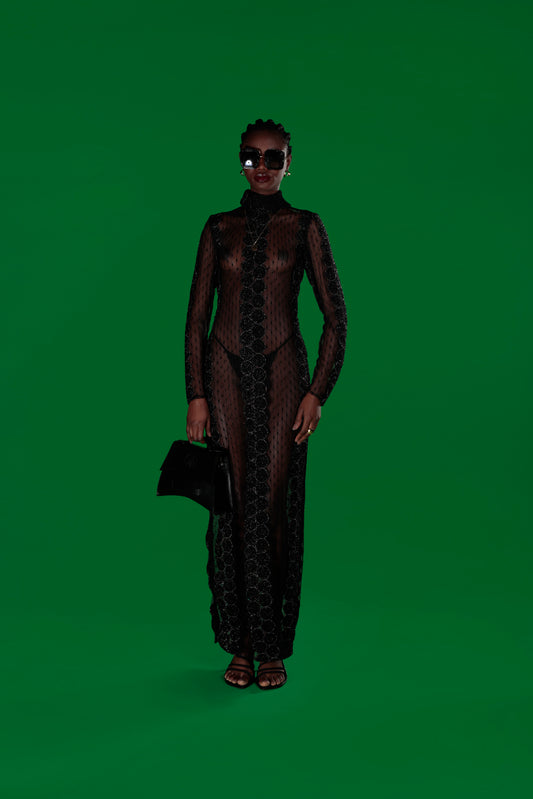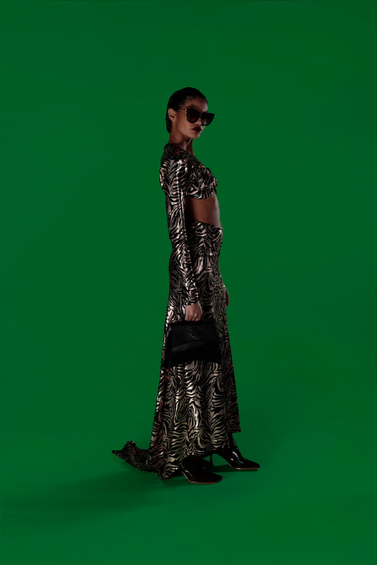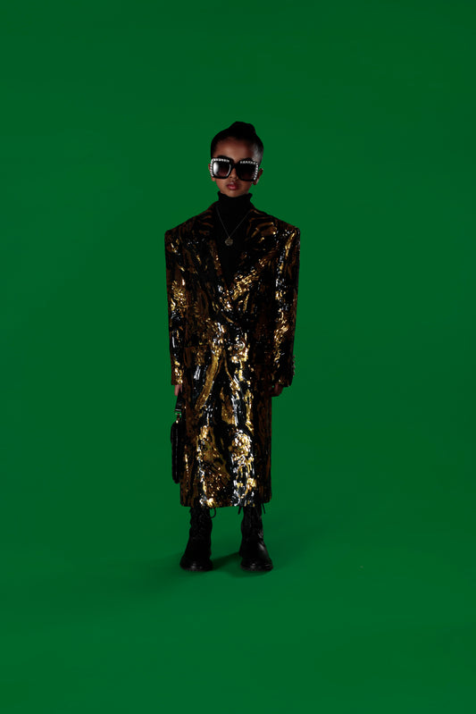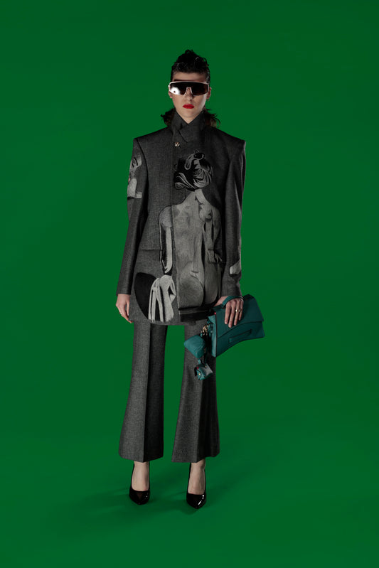 Each piece is created using a variety of fabrics from cashmere wool and tartan to velvet and sustainable vegan leather. Some pieces are created out of a mesh that is embellished with either pearls or sequins that have been hand-embroidered using meticulous skill. The Helen Anthony exclusive print fabric is used to create flowing gowns, three-piece suits and scarves, leather and monogram print unisex bags and accessories. With an abundance of sheer fabrics that bare all to latex three-piece suits that characterise the body’s contours. The uncompromising gold accents of smooth metal hardware embellish the collection with a robust yet unsettling glare of intent.