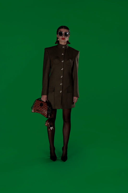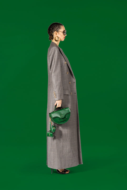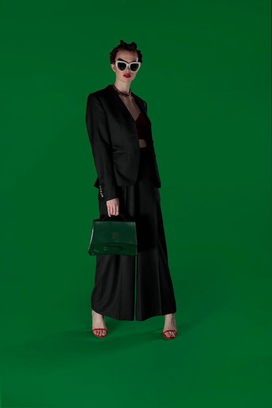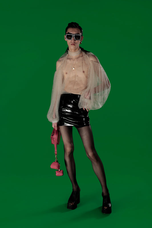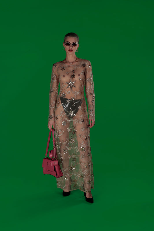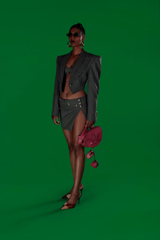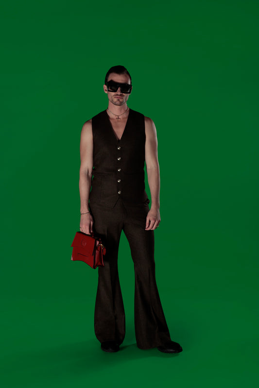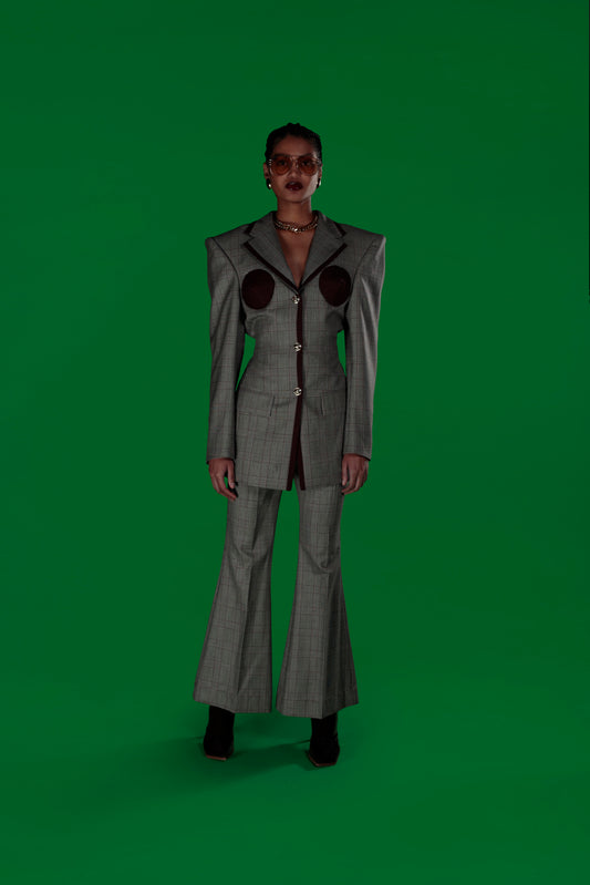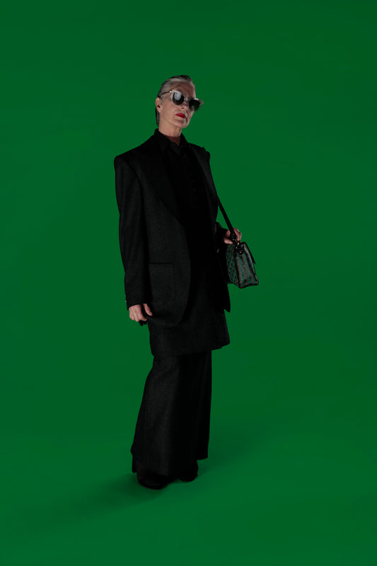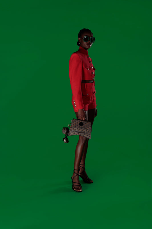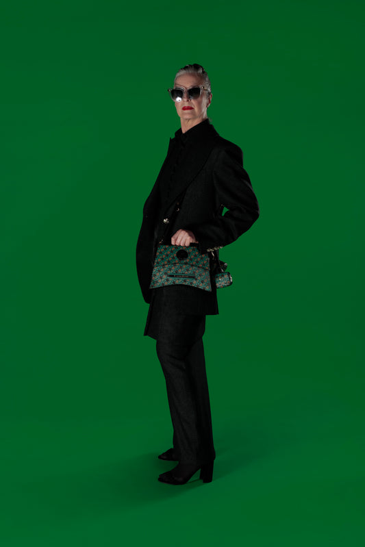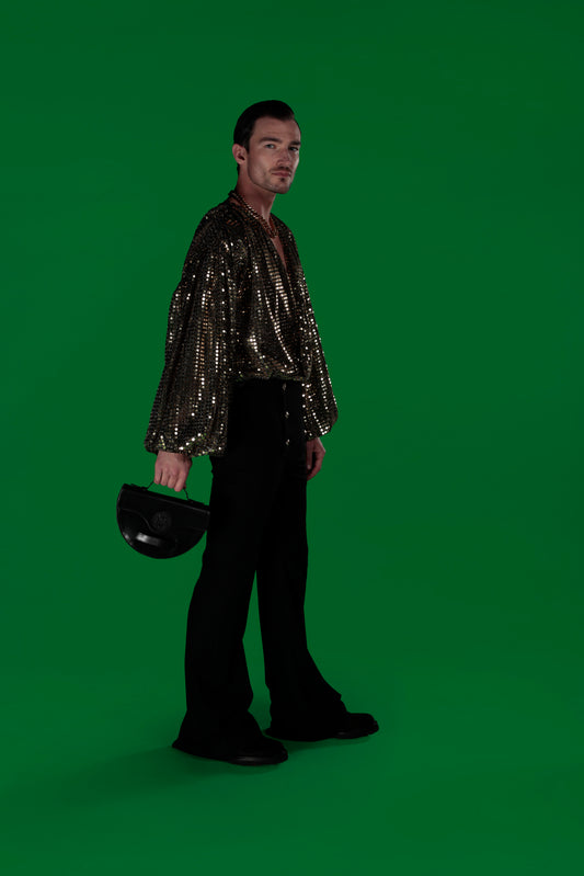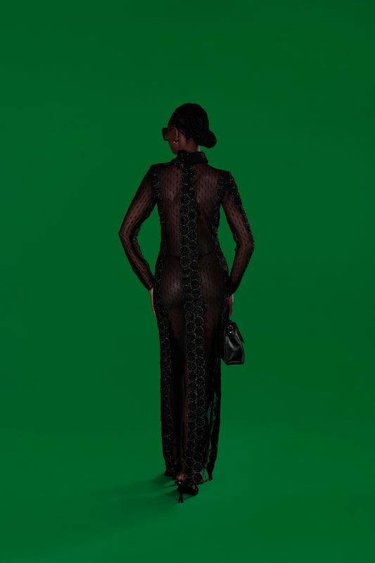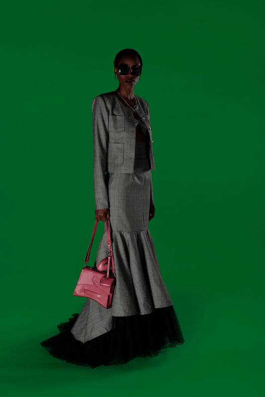 Each piece is created using a variety of fabrics from cashmere wool and tartan to velvet and sustainable vegan leather. Some pieces are created out of a mesh that is embellished with either pearls or sequins that have been hand-embroidered using meticulous skill. The Helen Anthony exclusive print fabric is used to create flowing gowns, three-piece suits and scarves, leather and monogram print unisex bags and accessories. With an abundance of sheer fabrics that bare all to latex three-piece suits that characterise the body’s contours. The uncompromising gold accents of smooth metal hardware embellish the collection with a robust yet unsettling glare of intent.