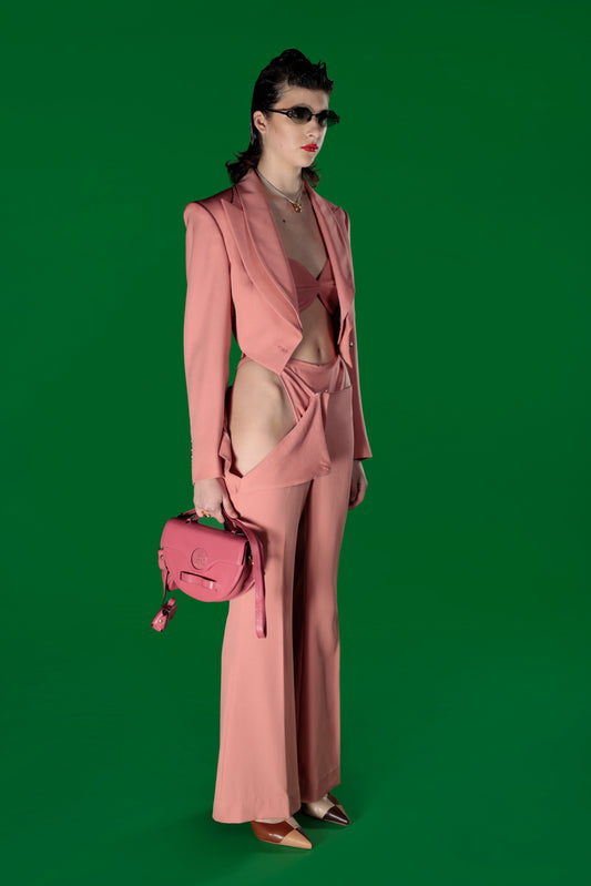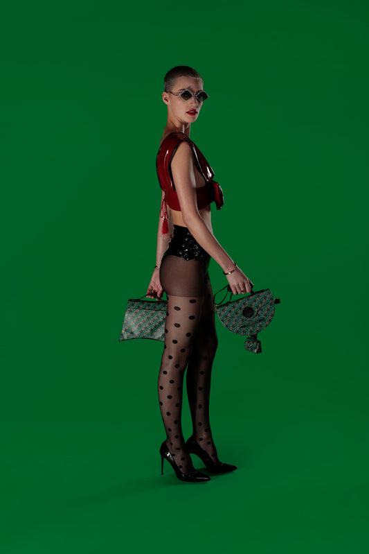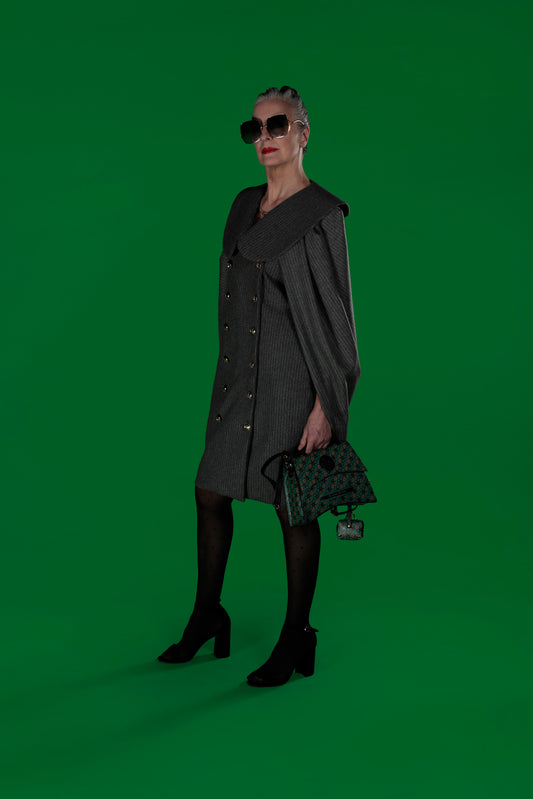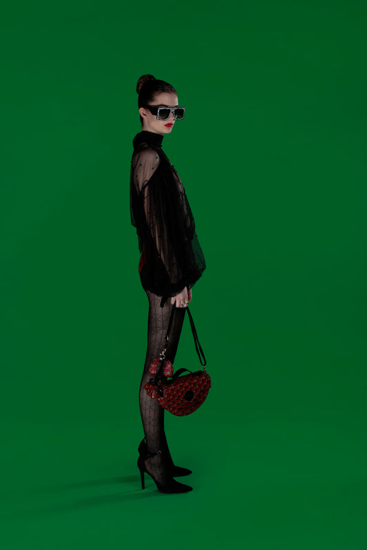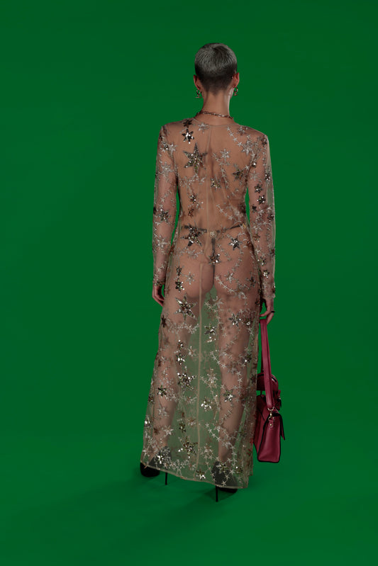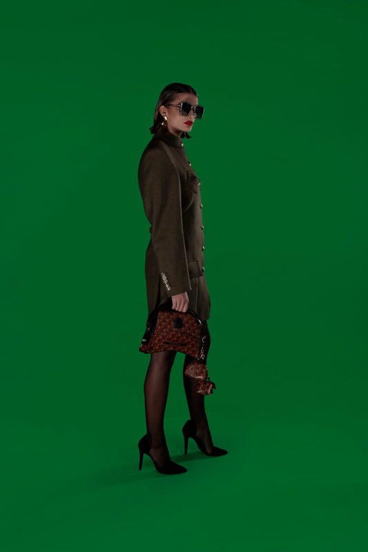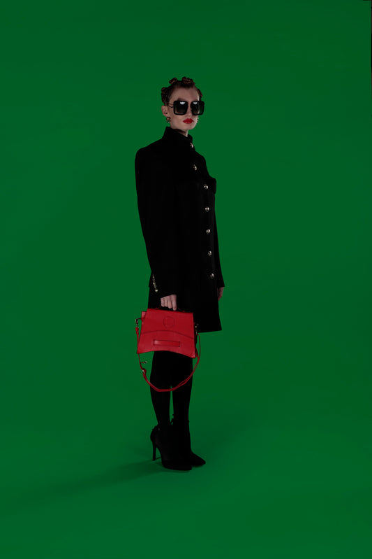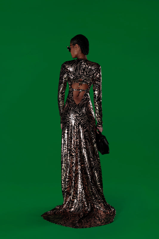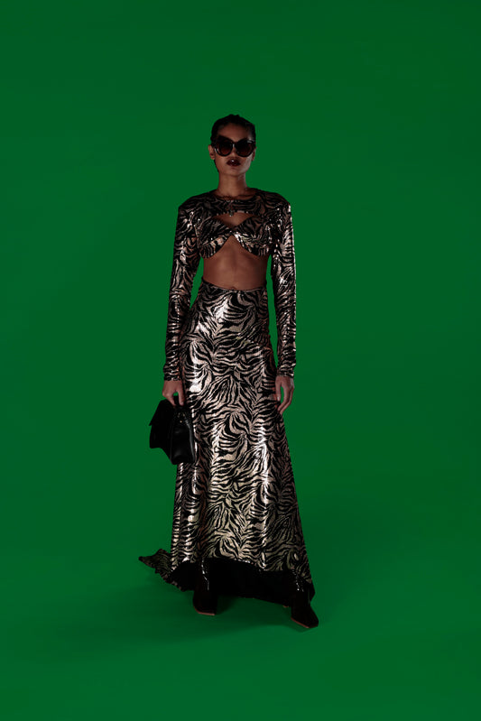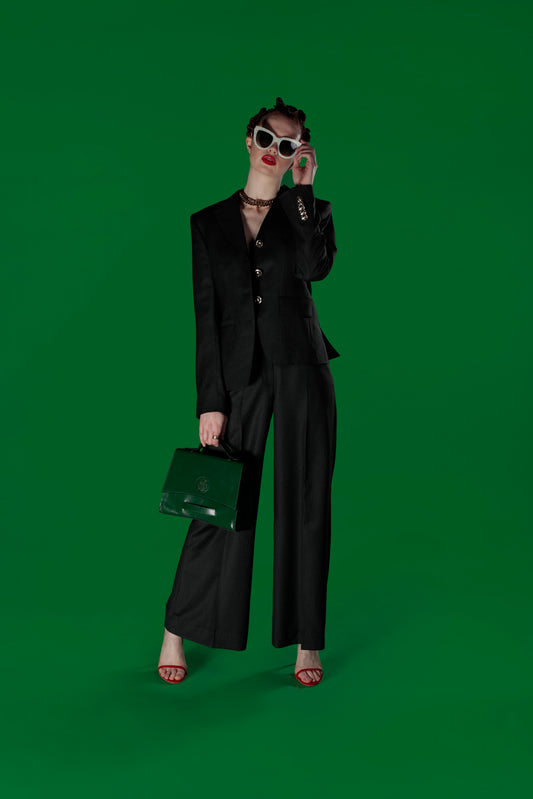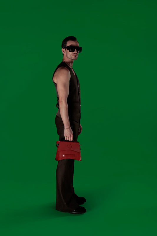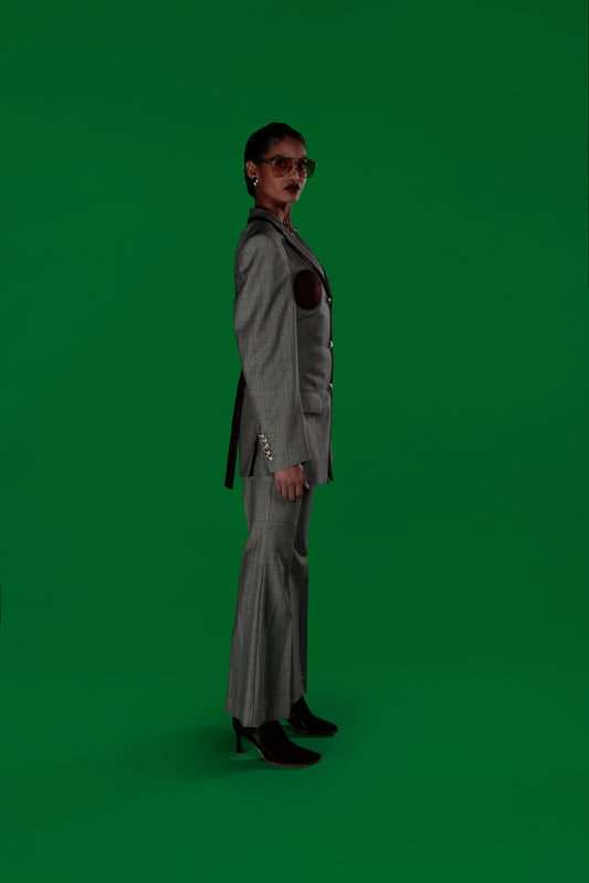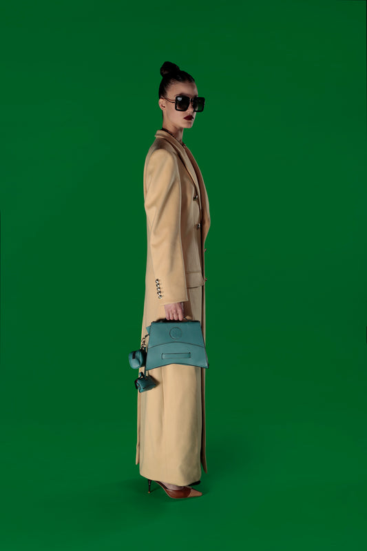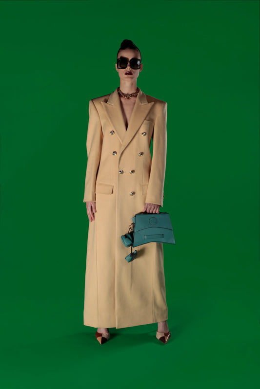Each piece is created using a variety of fabrics from cashmere wool and tartan to velvet and sustainable vegan leather. Some pieces are created out of a mesh that is embellished with either pearls or sequins that have been hand-embroidered using meticulous skill. The Helen Anthony exclusive print fabric is used to create flowing gowns, three-piece suits and scarves, leather and monogram print unisex bags and accessories. With an abundance of sheer fabrics that bare all to latex three-piece suits that characterise the body’s contours. The uncompromising gold accents of smooth metal hardware embellish the collection with a robust yet unsettling glare of intent.