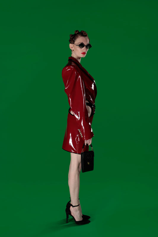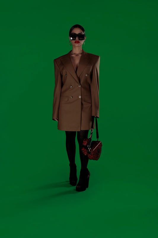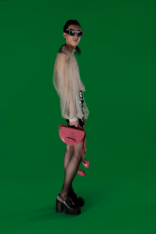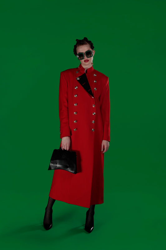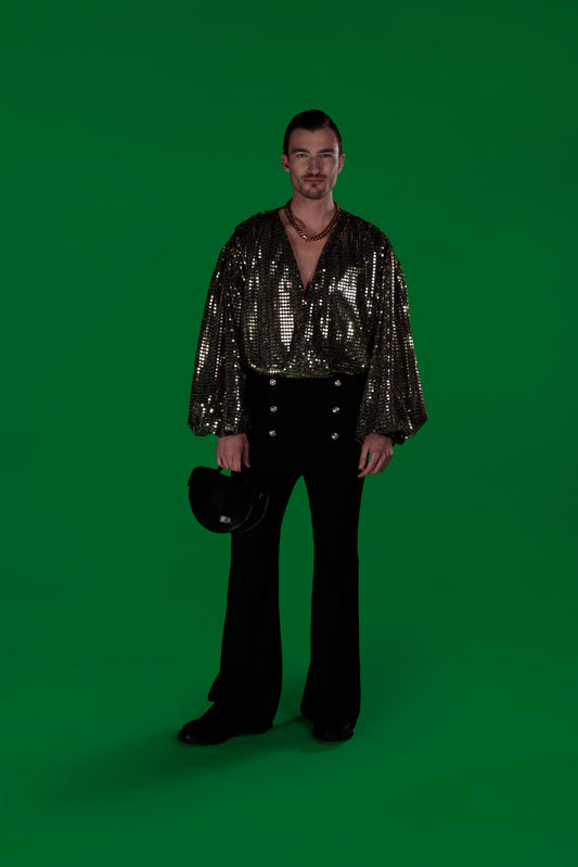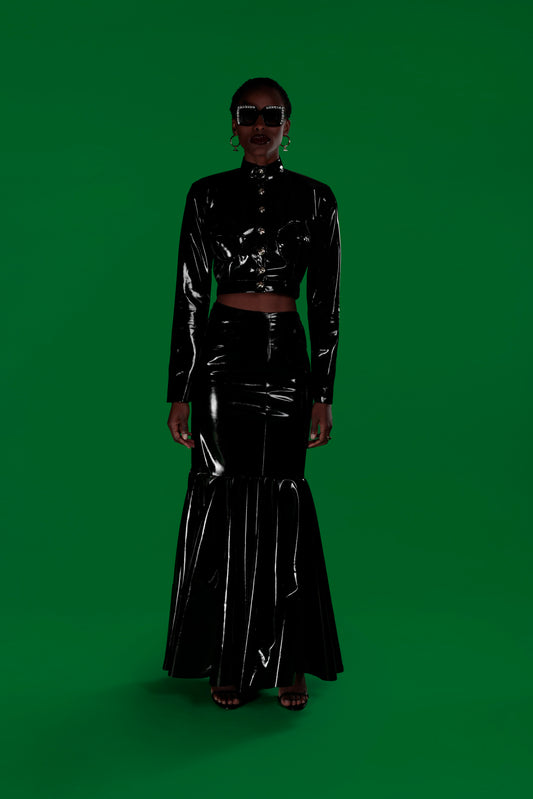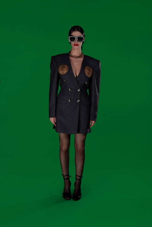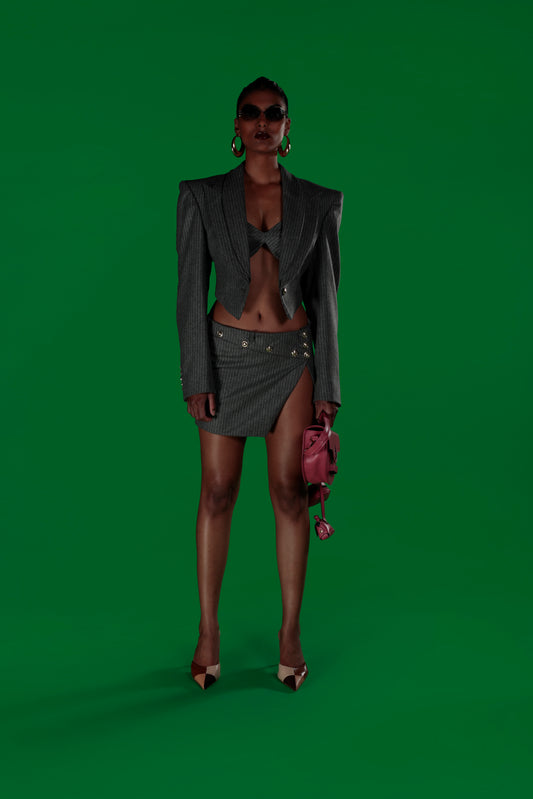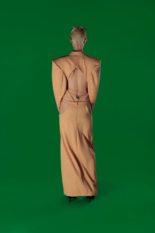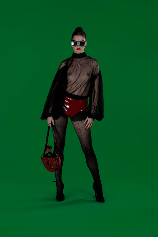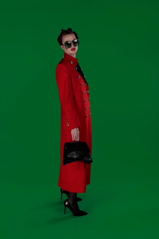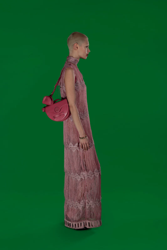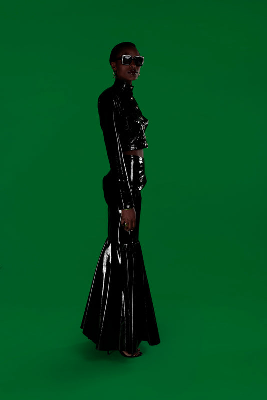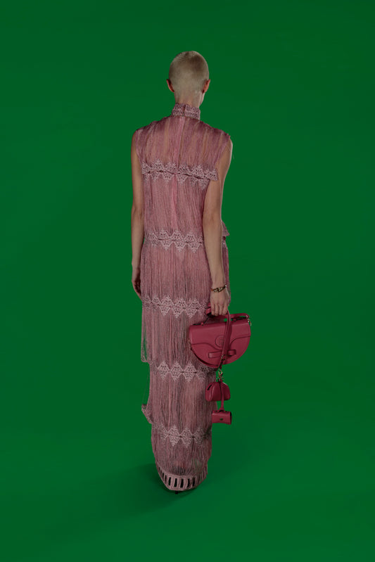 Each piece is created using a variety of fabrics from cashmere wool and tartan to velvet and sustainable vegan leather. Some pieces are created out of a mesh that is embellished with either pearls or sequins that have been hand-embroidered using meticulous skill. The Helen Anthony exclusive print fabric is used to create flowing gowns, three-piece suits and scarves, leather and monogram print unisex bags and accessories. With an abundance of sheer fabrics that bare all to latex three-piece suits that characterise the body’s contours. The uncompromising gold accents of smooth metal hardware embellish the collection with a robust yet unsettling glare of intent.