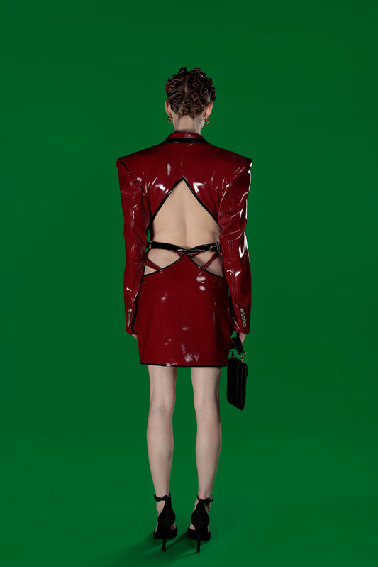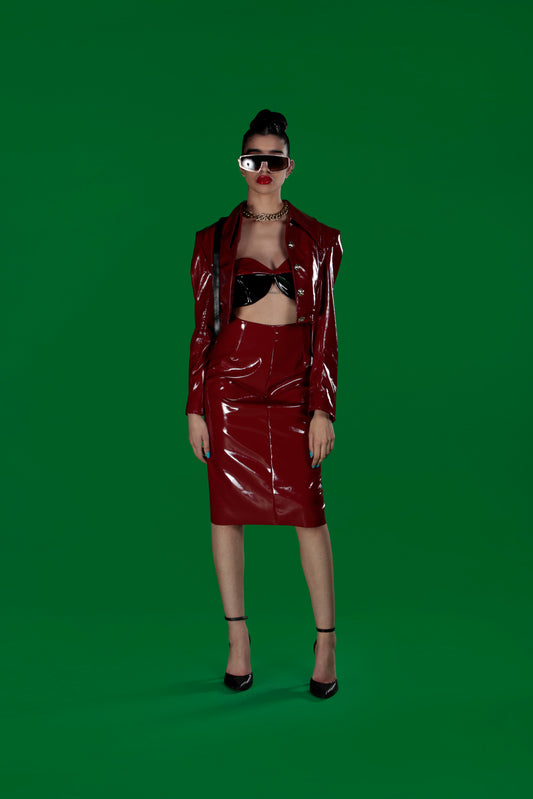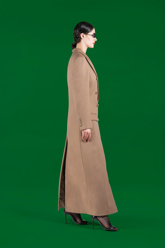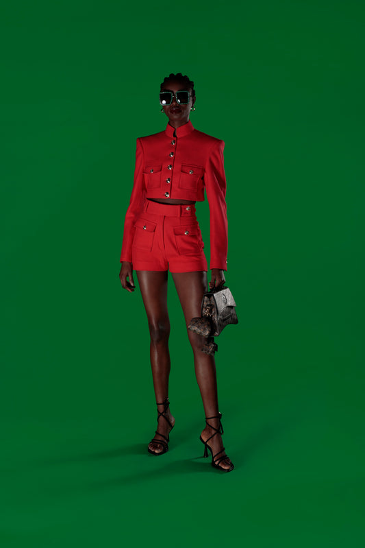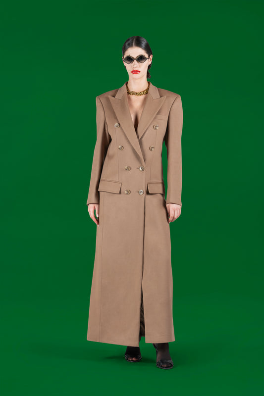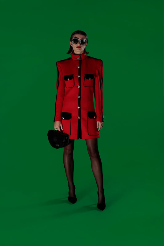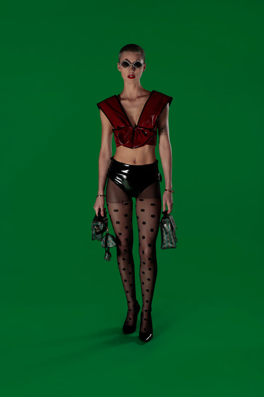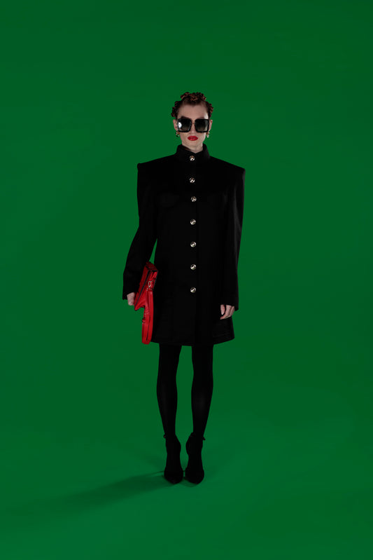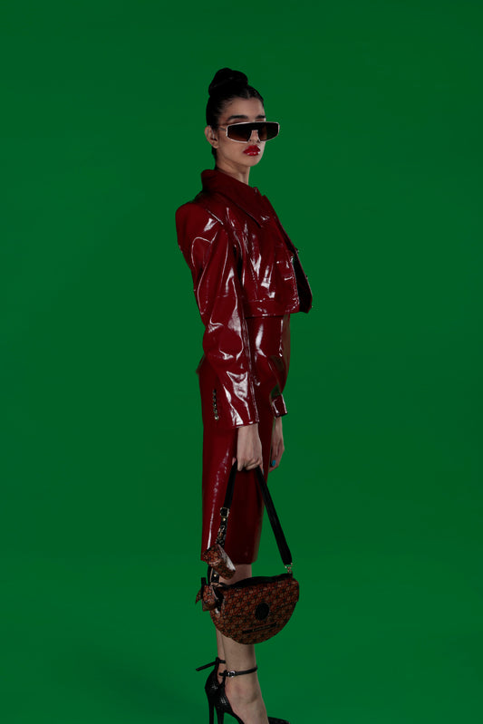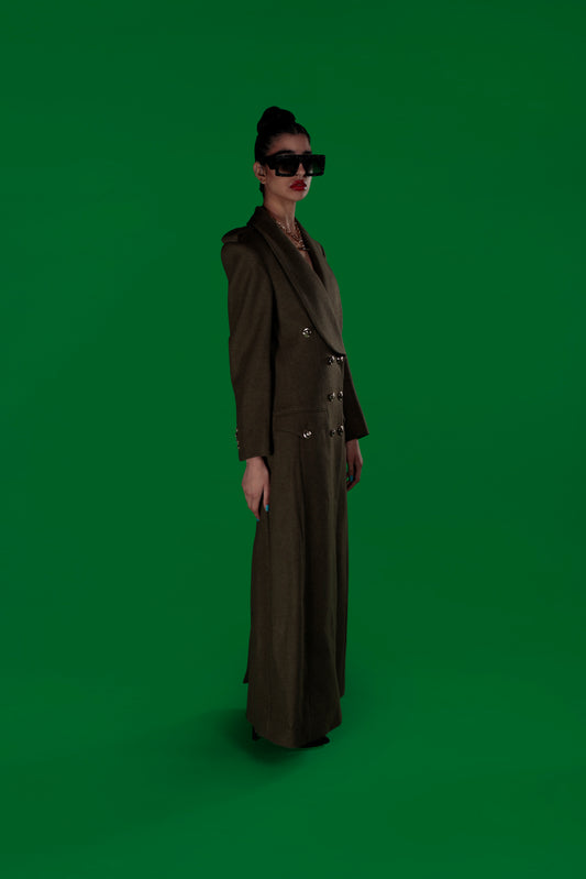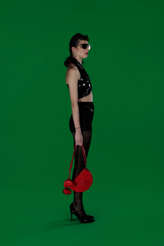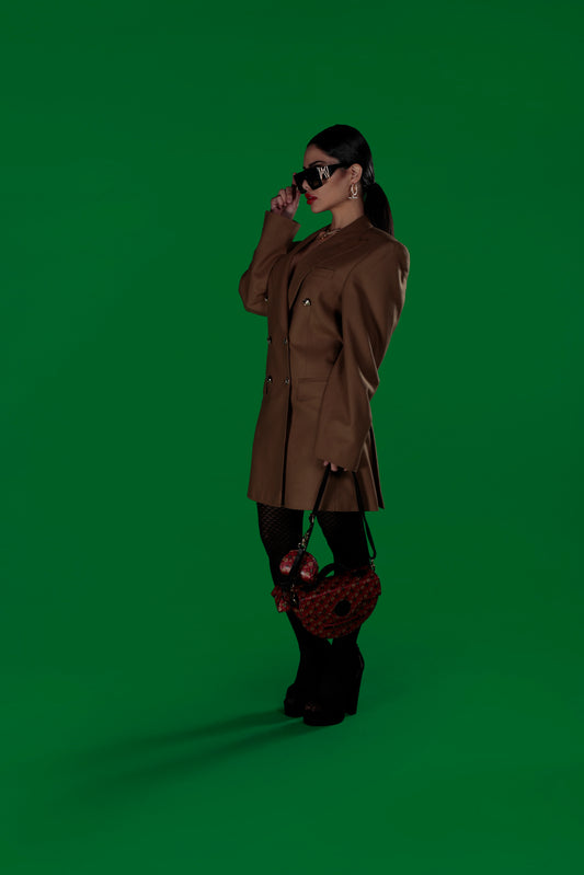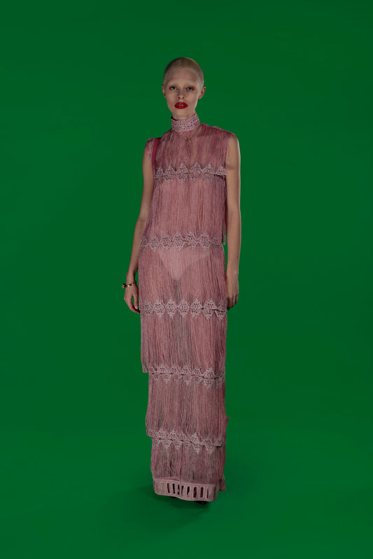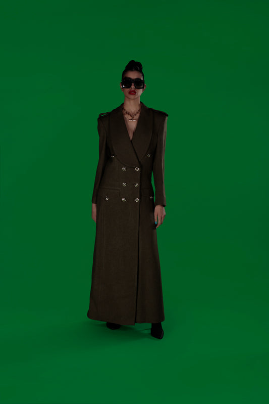 Each piece is created using a variety of fabrics from cashmere wool and tartan to velvet and sustainable vegan leather. Some pieces are created out of a mesh that is embellished with either pearls or sequins that have been hand-embroidered using meticulous skill. The Helen Anthony exclusive print fabric is used to create flowing gowns, three-piece suits and scarves, leather and monogram print unisex bags and accessories. With an abundance of sheer fabrics that bare all to latex three-piece suits that characterise the body’s contours. The uncompromising gold accents of smooth metal hardware embellish the collection with a robust yet unsettling glare of intent.