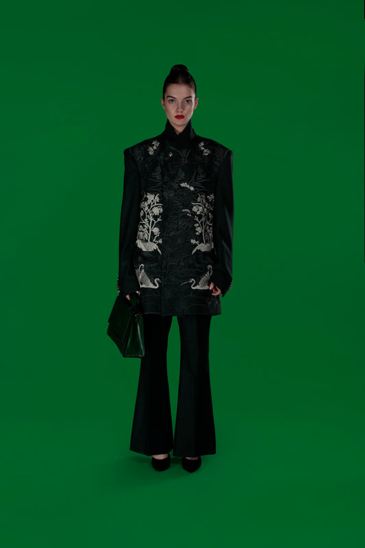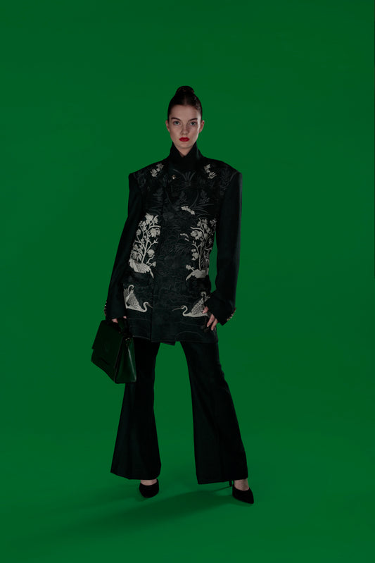 Helen Anthony is proud to use mostly sustainable fabrics that are made in the UK in collaboration with Huddersfield Fabrics and Lochcarron of Scotland. All of the highly skilled hand embroidery in this collection was done by S.N Murarka.