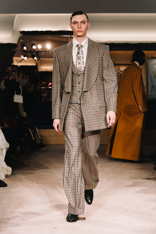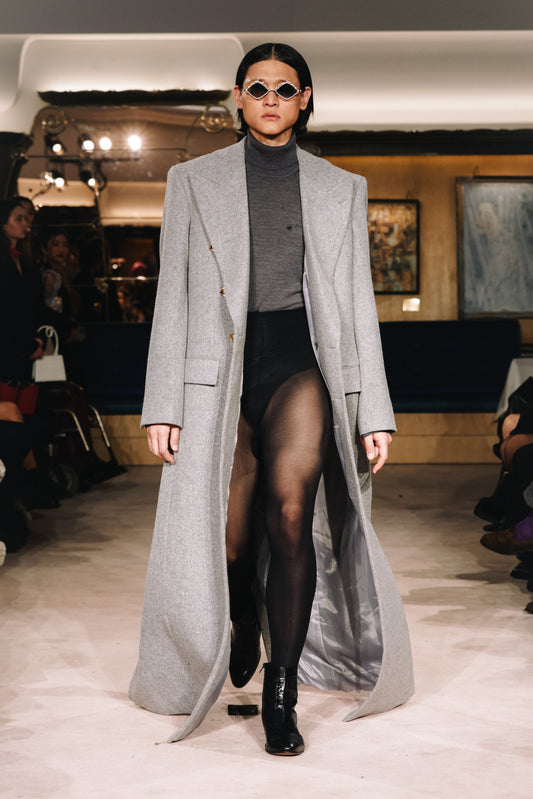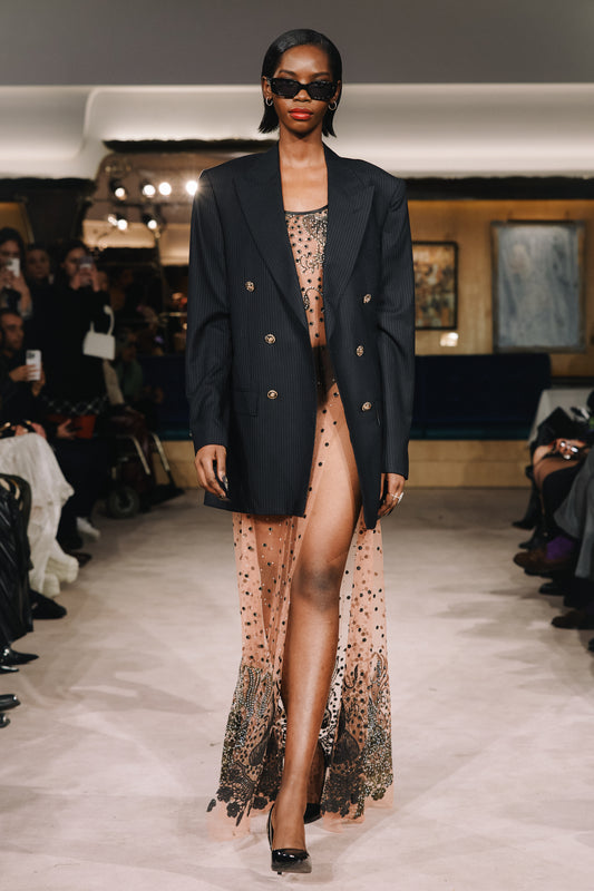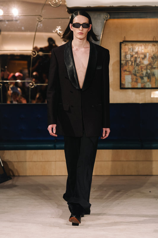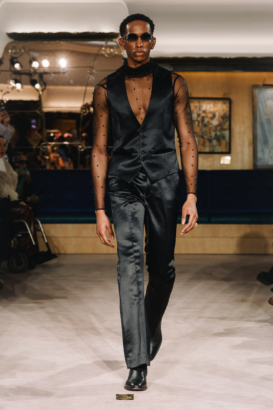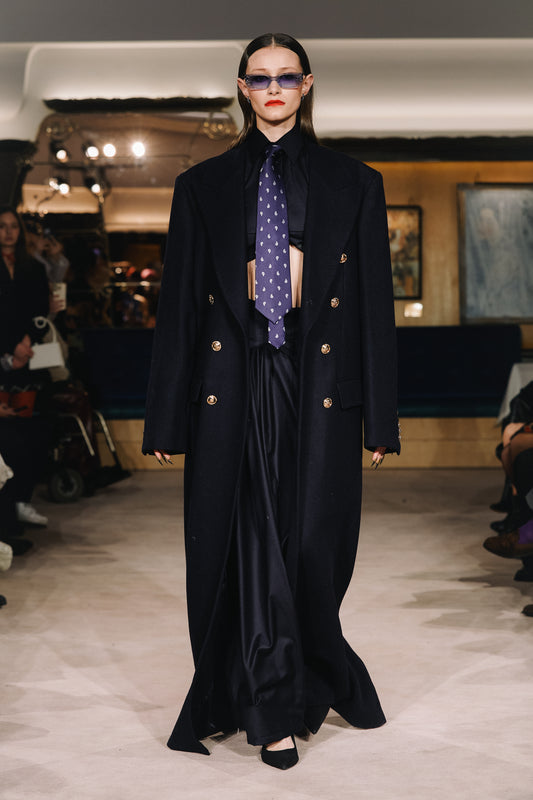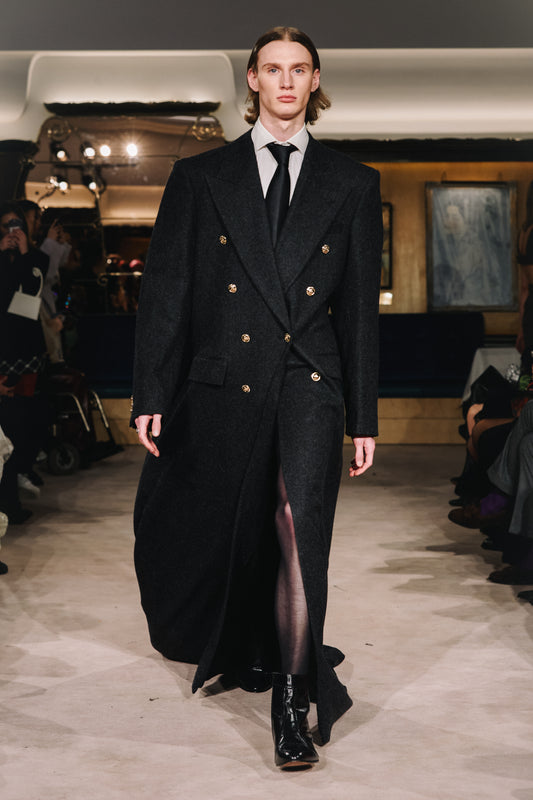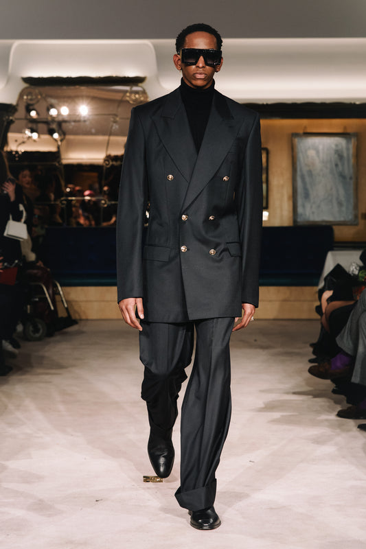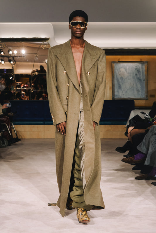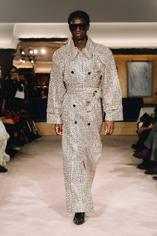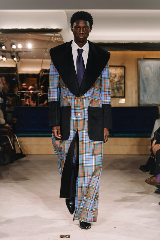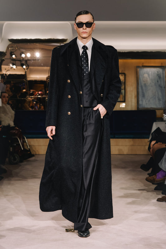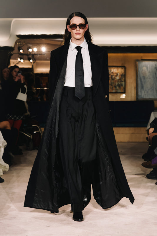 Alongside this are floor-length overcoats, powerful suits and tuxedos made using the highest standard of craftsmanship. Naeem Anthony has played with height and length, oversized and super-fitted to add an element of playfulness to well-structured British tailoring.
