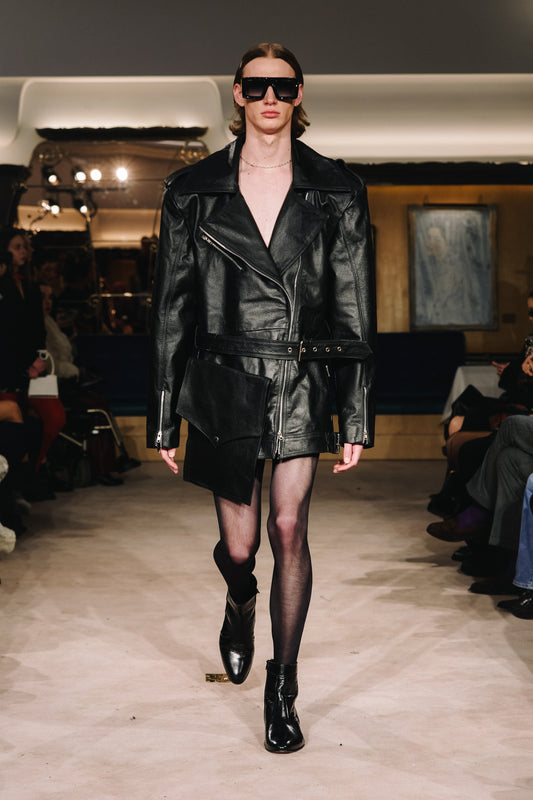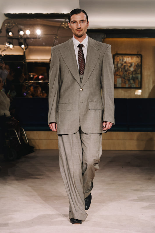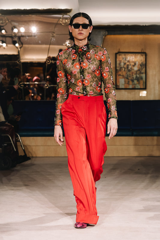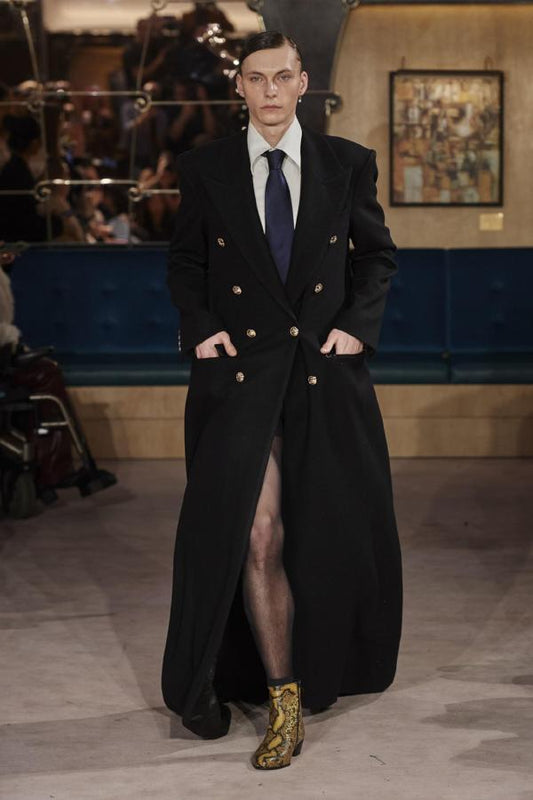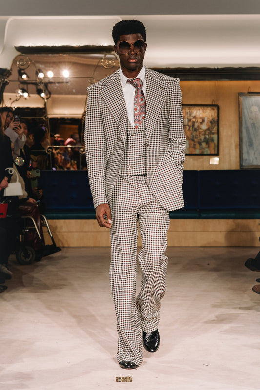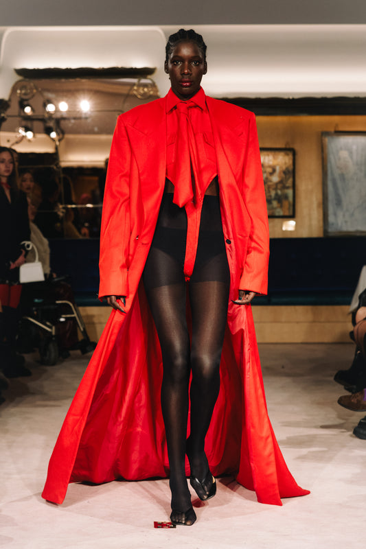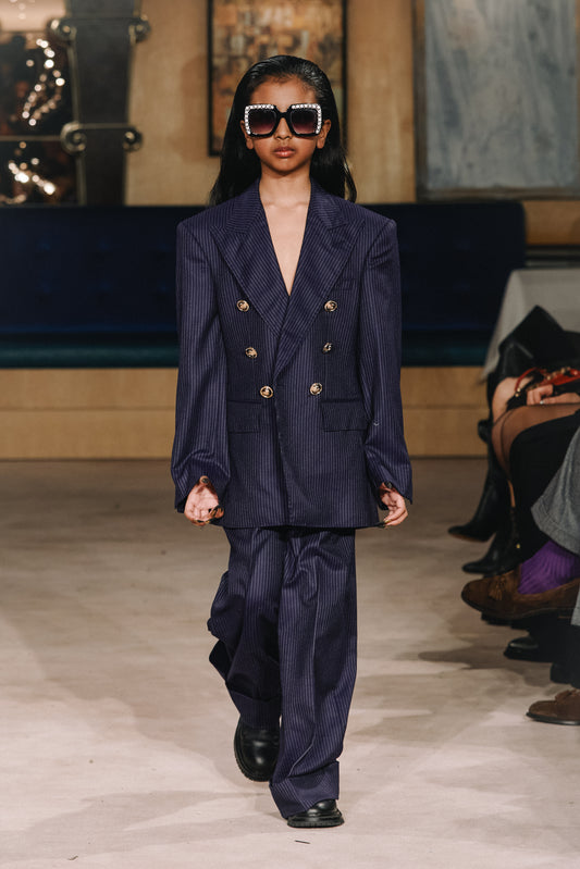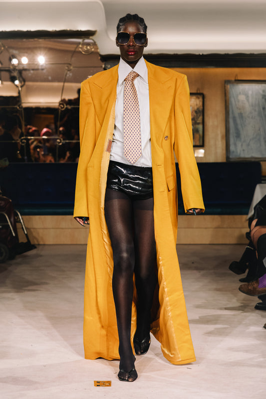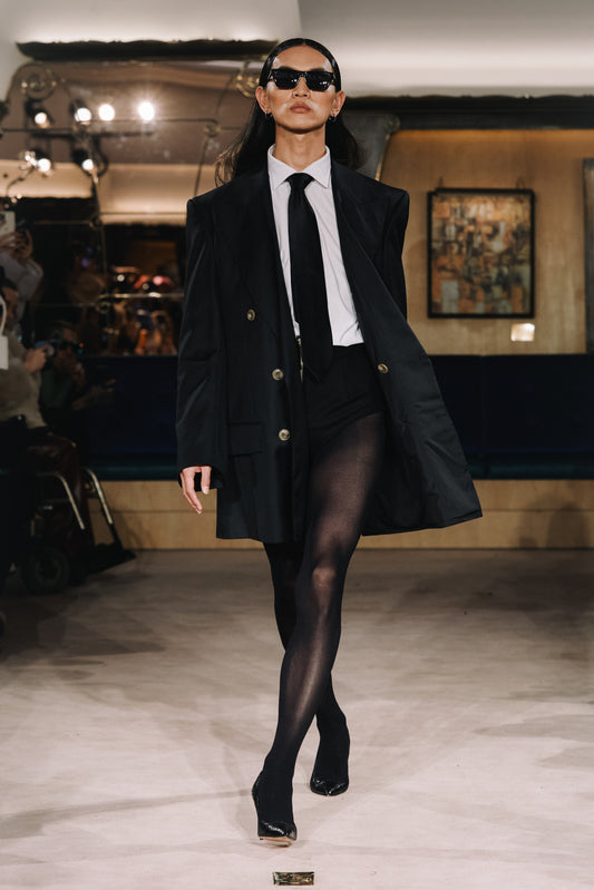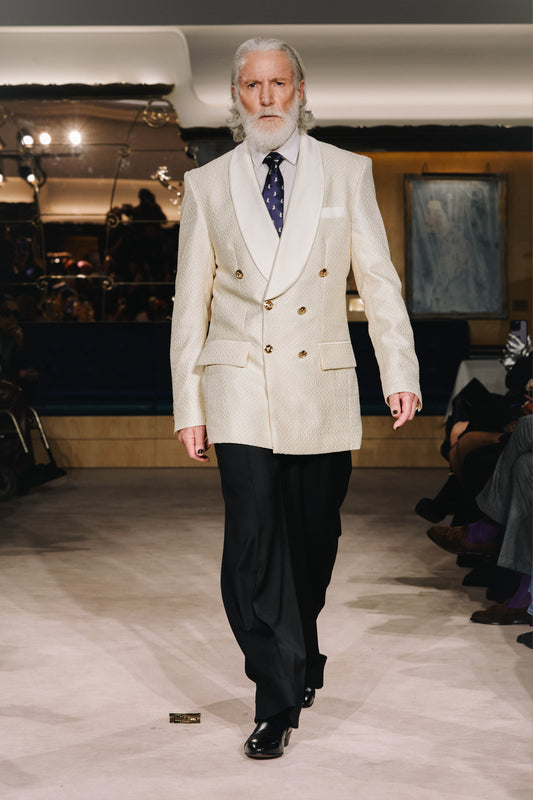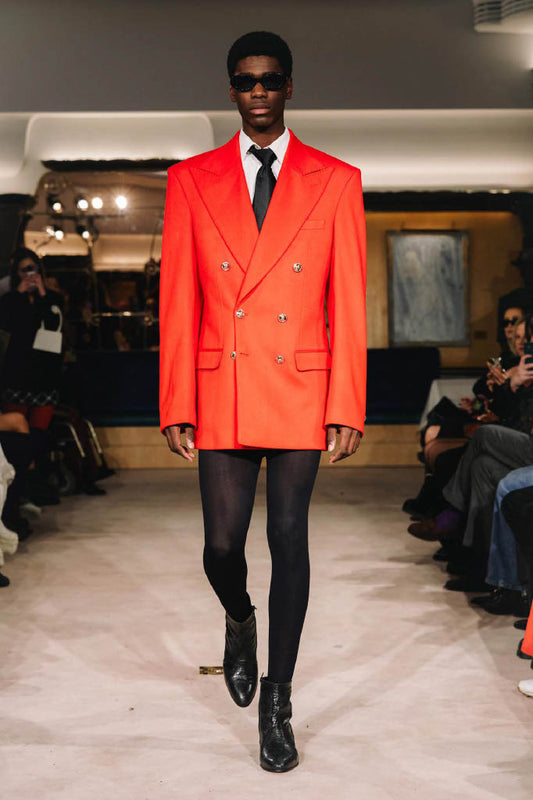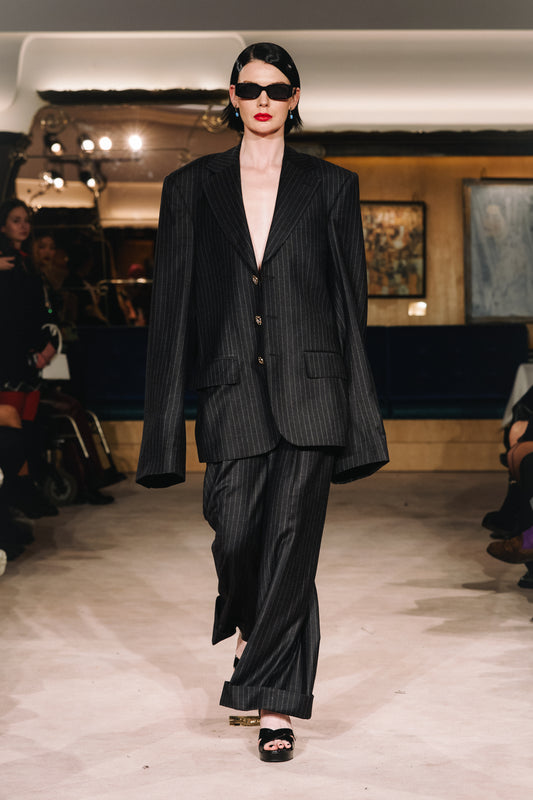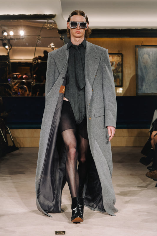 Alongside this are floor-length overcoats, powerful suits and tuxedos made using the highest standard of craftsmanship. Naeem Anthony has played with height and length, oversized and super-fitted to add an element of playfulness to well-structured British tailoring.
