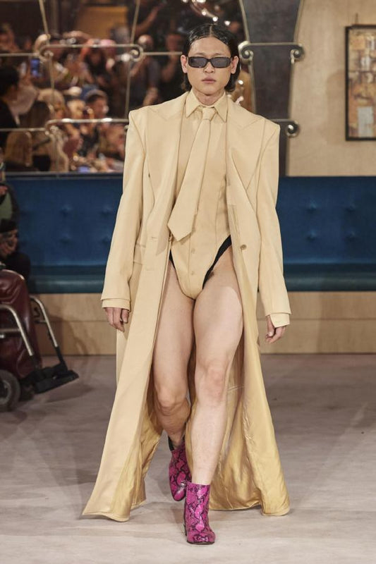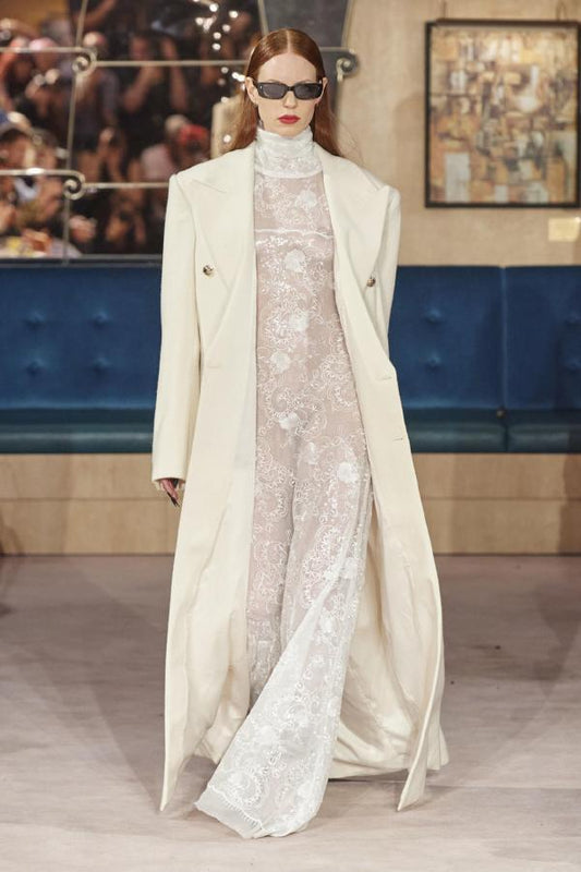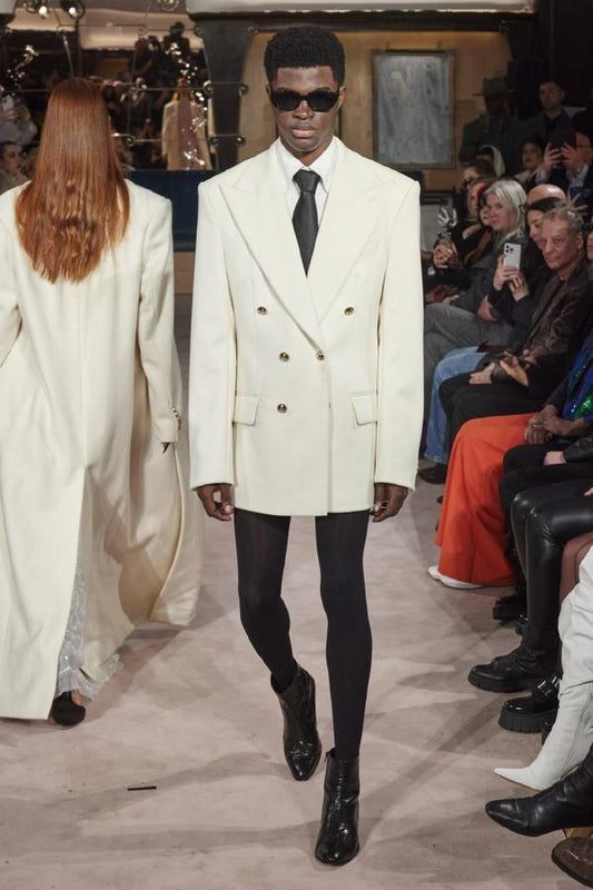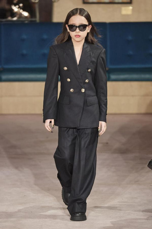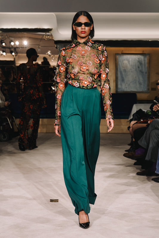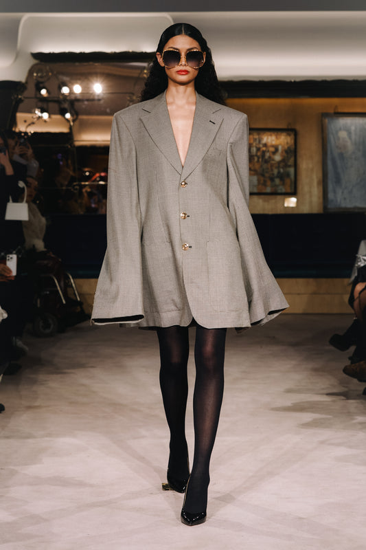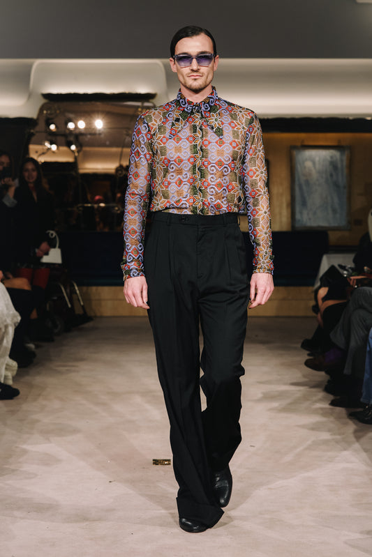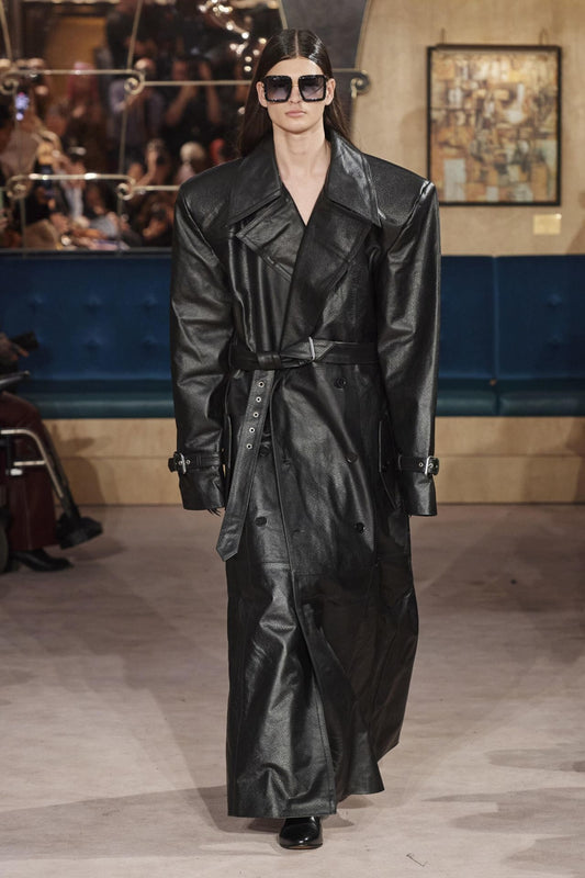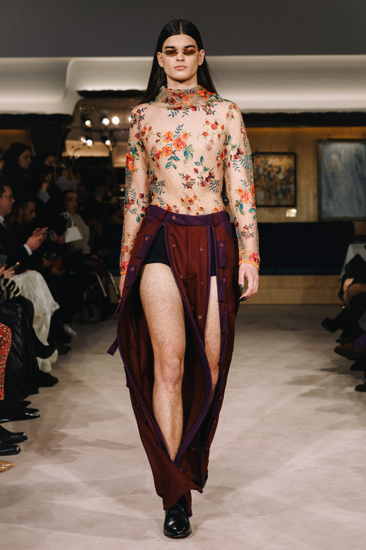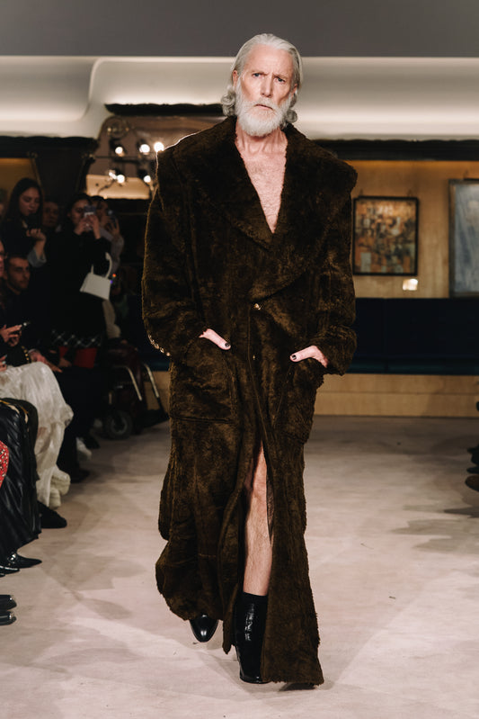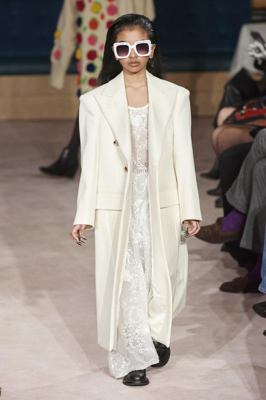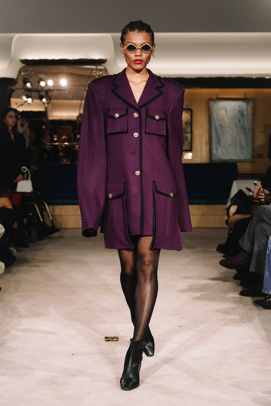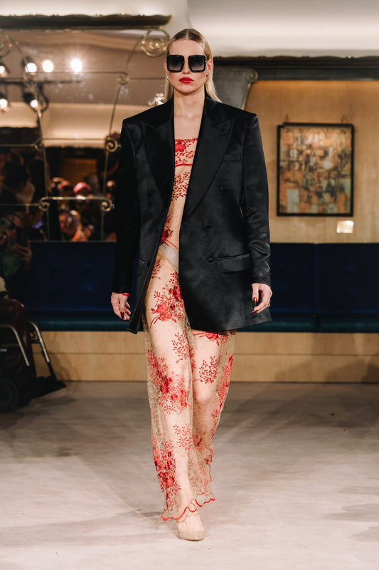 Alongside this are floor-length overcoats, powerful suits and tuxedos made using the highest standard of craftsmanship. Naeem Anthony has played with height and length, oversized and super-fitted to add an element of playfulness to well-structured British tailoring.