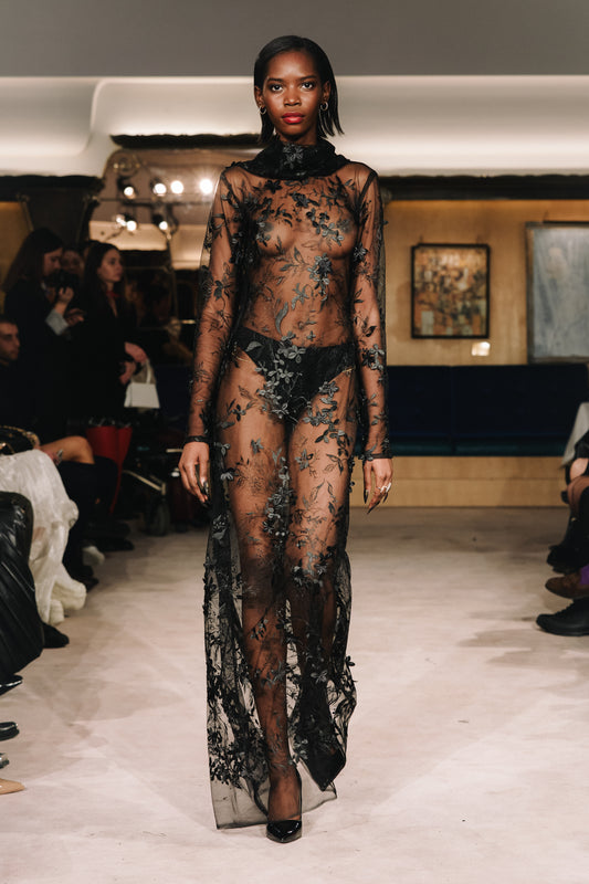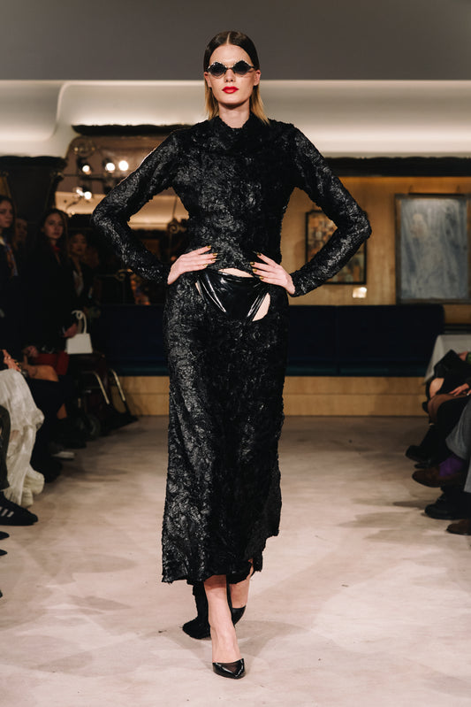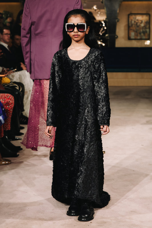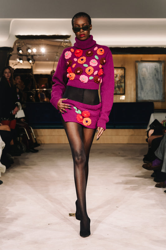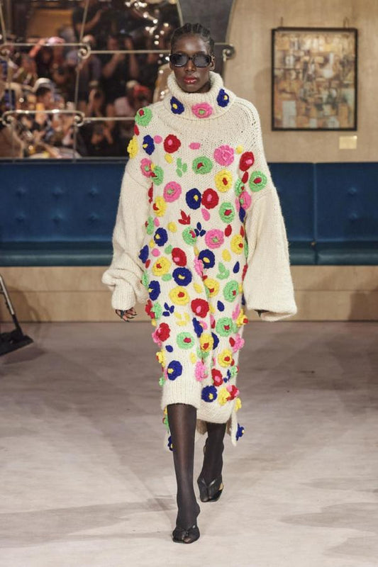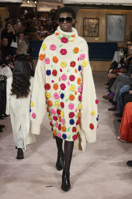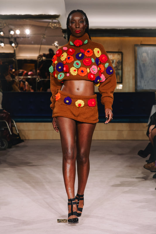 The collection boasts chic and elegant clothing that has been made with hours of impeccable hand-work. For example, a chunky oversized black and off-white hand-knitted jumper has been elevated with a crochet multicoloured flower. There are also flowers hand-embroidered onto dresses. Naeem Anthony also designs his own exclusive fabrics.
