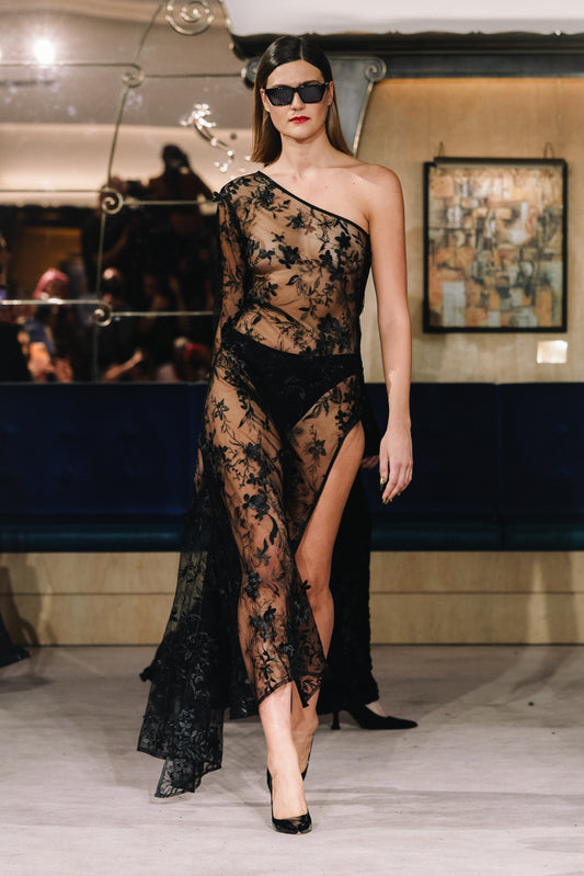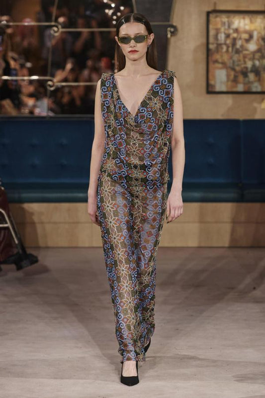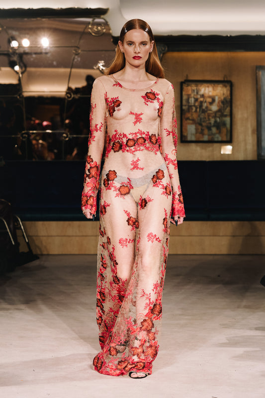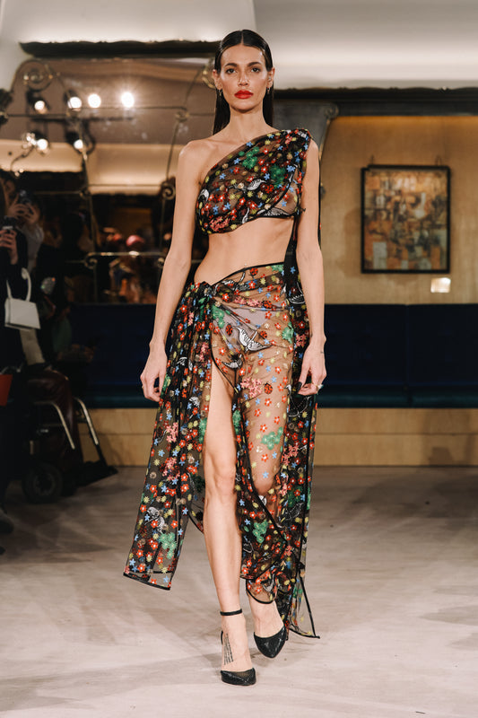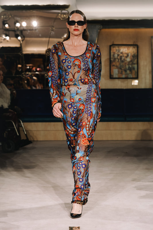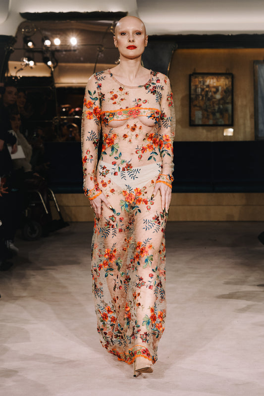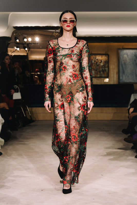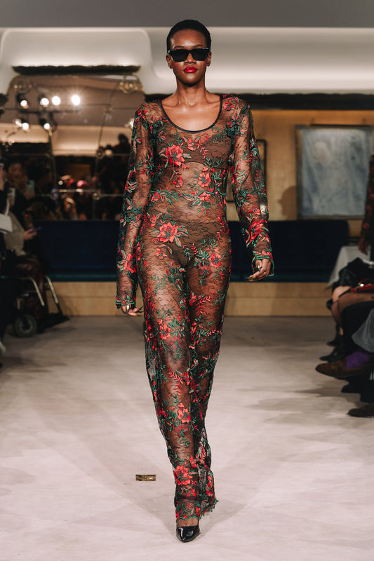 The collection boasts chic and elegant clothing that has been made with hours of impeccable hand-work. For example, a chunky oversized black and off-white hand-knitted jumper has been elevated with a crochet multicoloured flower. There are also flowers hand-embroidered onto dresses. Naeem Anthony also designs his own exclusive fabrics.