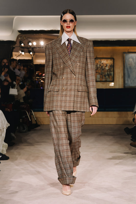 This collection also plays with different prints and fabrics. It features wool, cashmere, tartan, mesh, and animal printed sustainable leather. For this collection Helen Anthony has collaborated with British luxury textile company Scabal to create luxury fabrics that perfectly reflect the brand. The audience will witness an array of colours transcend down the runway – in this collection colour is used to reflect different cultures and diversity.